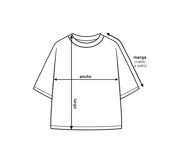 Colocá la remera sobre una superficie plana y compará tus medidas con la infografía y la tabla a continuación para elegir tu talle ideal. Esto es especialmente útil para remeras oversize.
